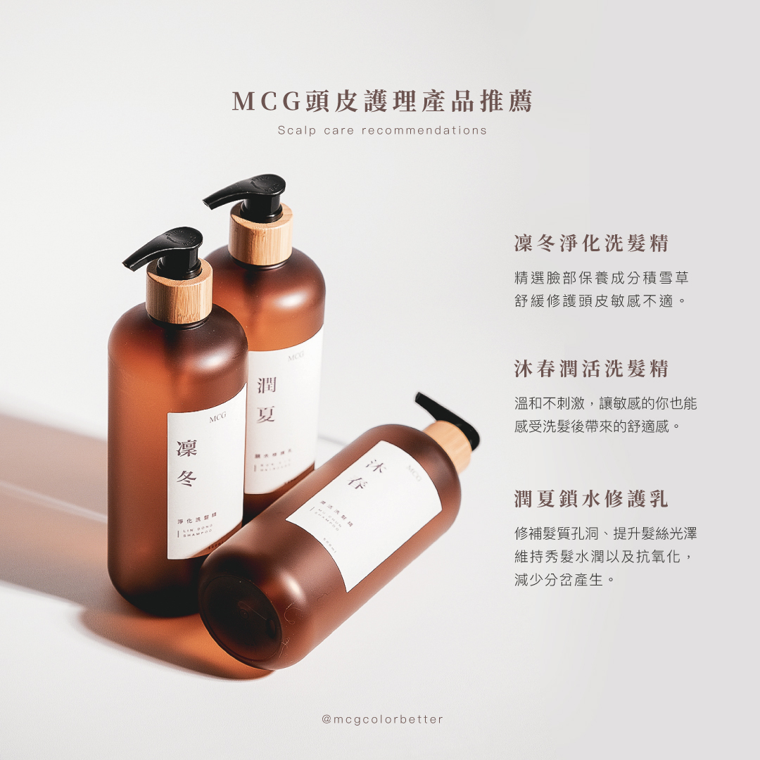 若妳還沒尋找到適合自己的洗髮精,MCG推薦出油嚴重對象可以使用大地根迭系列-凜冬淨化洗髮精,添加薄荷成分,有助於舒緩頭皮緊繃感。如頭皮種類為乾性的對象,可以選擇大地根迭系列-沐春潤活洗髮精,加強頭皮保水功能,使頭髮保持基礎水潤。