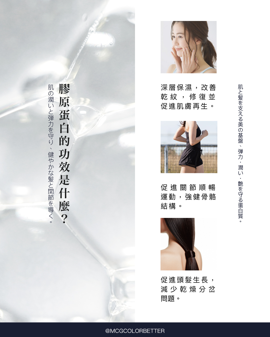 膠原蛋白是維持肌膚彈性、水潤與組織結構的重要蛋白質,除了能幫助肌膚保水、促進傷口癒合,對於頭髮健康也有正面作用——提升髮絲強韌性、光澤度,減少斷裂和脫落等等,是對「養顏+養髮」都有幫助的關鍵營養素。