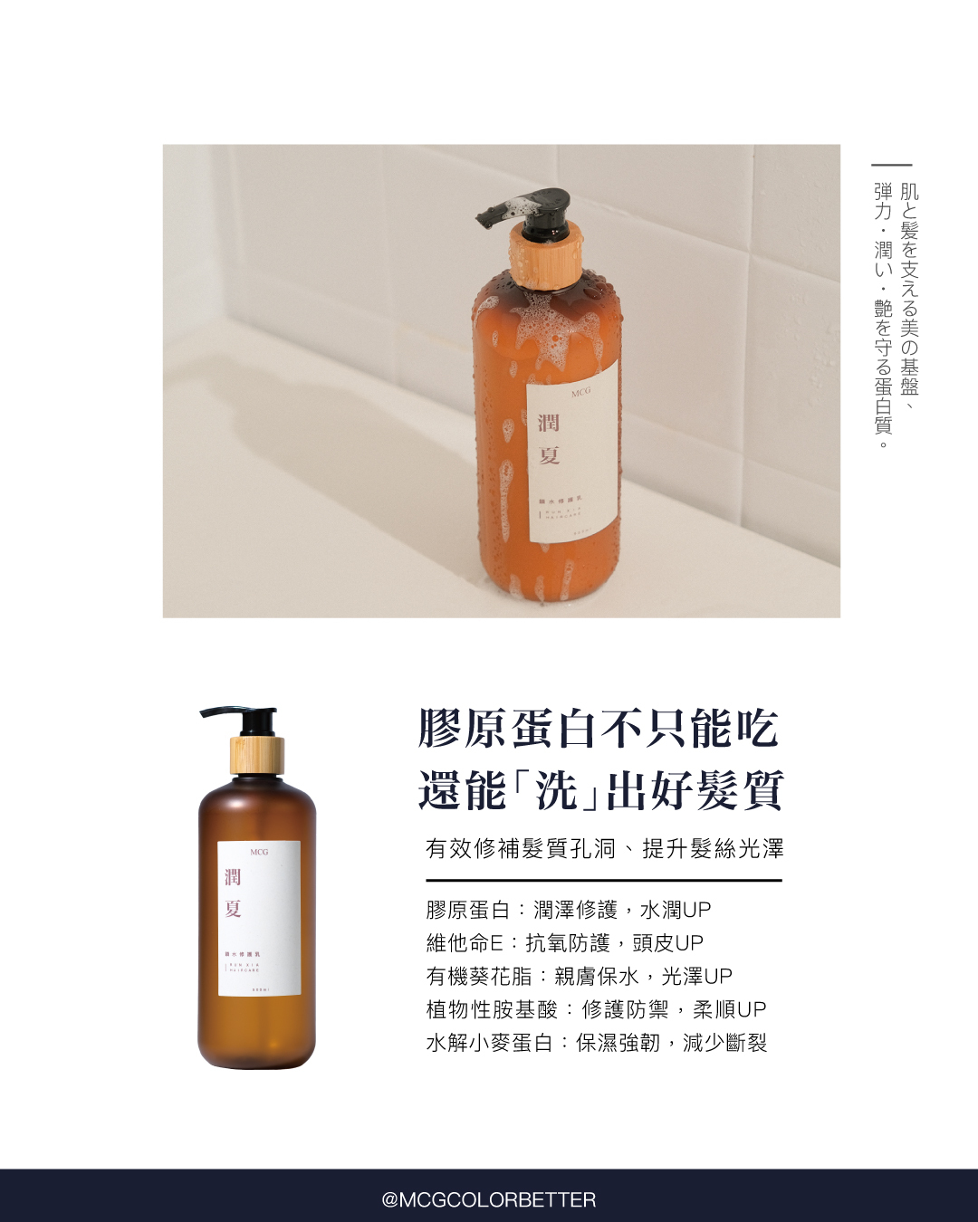 膠原蛋白不只是養顏美容,更是養髮的好幫手!現在就體驗【潤夏鎖水修護乳】,改善乾燥、分岔困擾,洗後頭髮柔順水亮,讓膠原蛋白的力量真正發揮吧!
