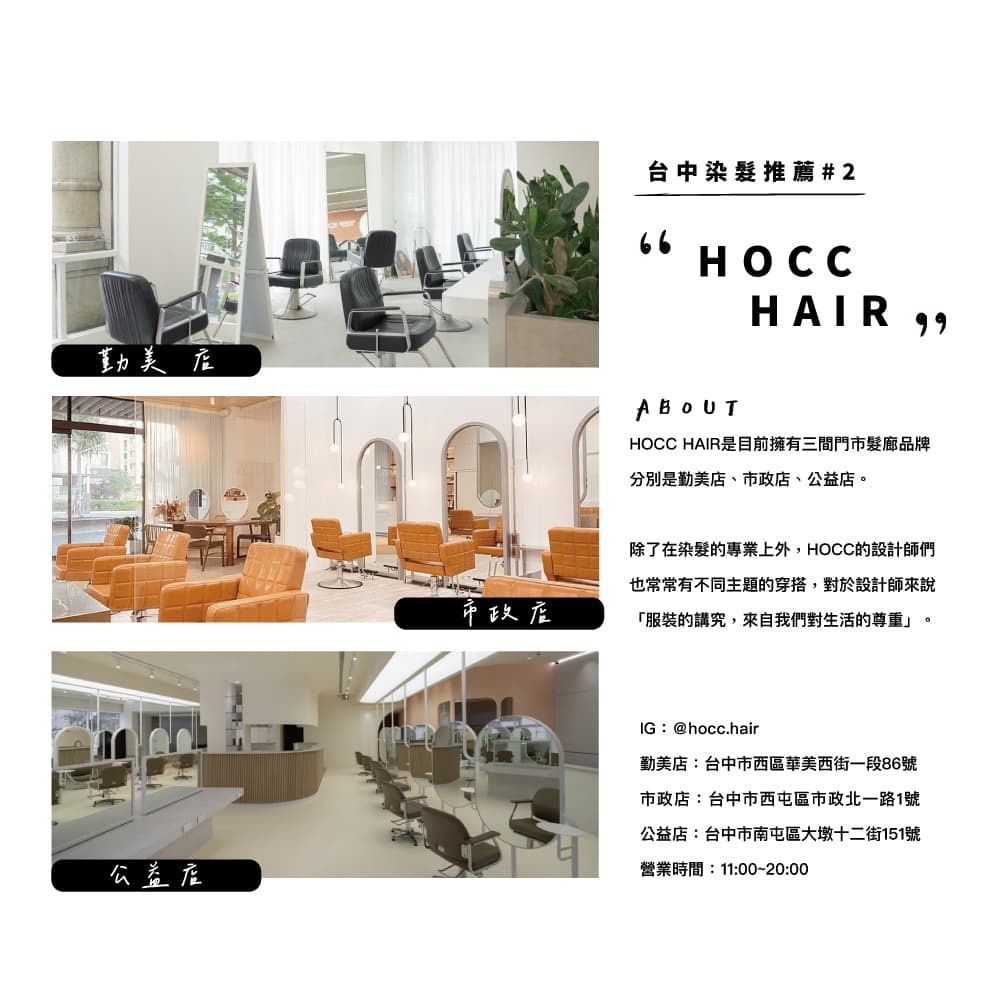 HOCC HAIR是目前擁有三間門市髮廊品牌,分別是位在勤美的𝐇𝐎𝐂𝐂 勤美店、台中市政府旁的𝐇𝐎𝐂𝐂 市政店、靠近捷運文心森林公園站的𝐇𝐎𝐂𝐂 公益店。