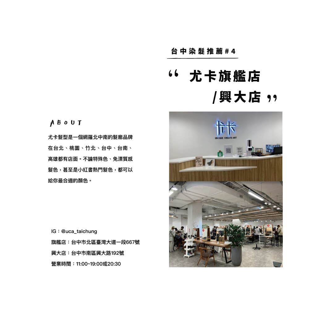 尤卡髮型是一個網羅北中南的髮廊品牌,在台北、桃園、竹北、台中、台南、高雄都有店面,台中擁有台中教育大學附近的尤卡旗艦店,以及中興大學旁的尤卡興大店。網路上累積眾多好評的尤卡,不論特殊色、免漂質感髮色,甚至是小紅書熱門髮色,都可以給你最合適的顏色,推薦各位可以從台中尤卡的ig作品集去找自己喜歡的設計師。