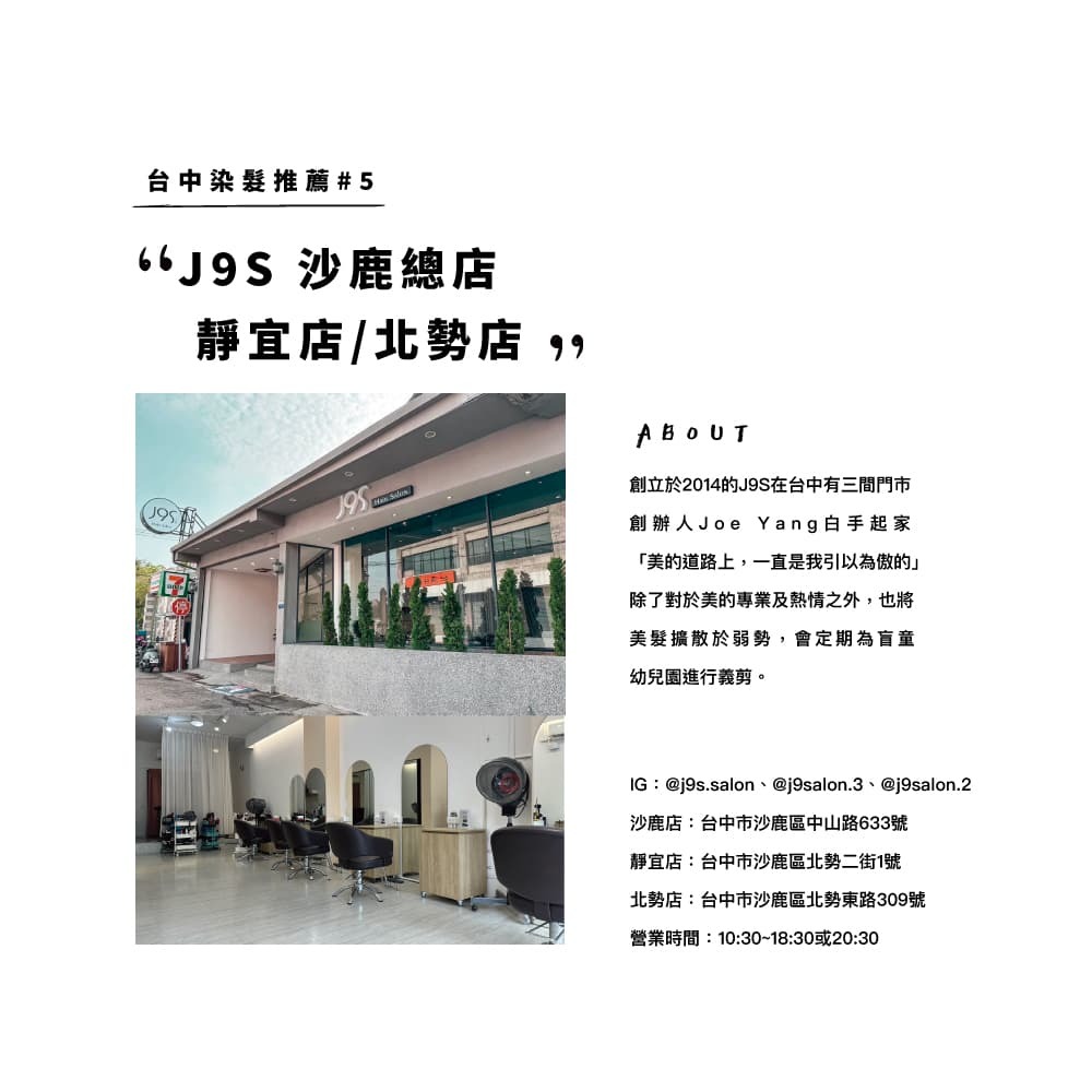 創立於2014的J9S在台中有三間門市,主要都位在沙鹿區,分別位於鹿寮的沙鹿總店,在靜宜大學附近的靜宜店,以及弘光科附近的北勢店。創辦人Joe Yang白手起家,從事美髮產業20年,對於美髮產業一直以來都相當堅持美的理念,「美的道路上,一直是我引以為傲的」。除了對於美的專業及熱情之外,也將美髮擴散於弱勢,會定期為盲童幼兒園進行義剪,雖然小朋友看不到自己外型的美,但設計師們都會尊重小朋友的想法去設計髮型,讓小朋友們能呈現出自己心中所想像的喜歡模樣。