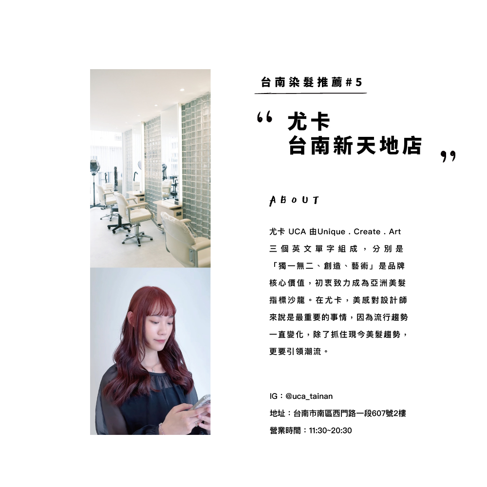尤卡 UCA 由Unique . Create . Art 三個英文單字組成,分別是「獨一無二、創造、藝術」,是品牌核心價值,初衷致力成為亞洲美髮指標沙龍。2010年創立於高雄,至今店點橫跨全台六都,尤卡台南新天地店坐落於知名地標新天地附近,提供最多元化的選擇,為每個人解決生活中頭髮帶來的困擾之外,更要塑造個人魅力。在尤卡,美感對設計師來說是最重要的事情,因為流行趨勢一直變化,除了抓住現今美髮趨勢,更要引領潮流。
