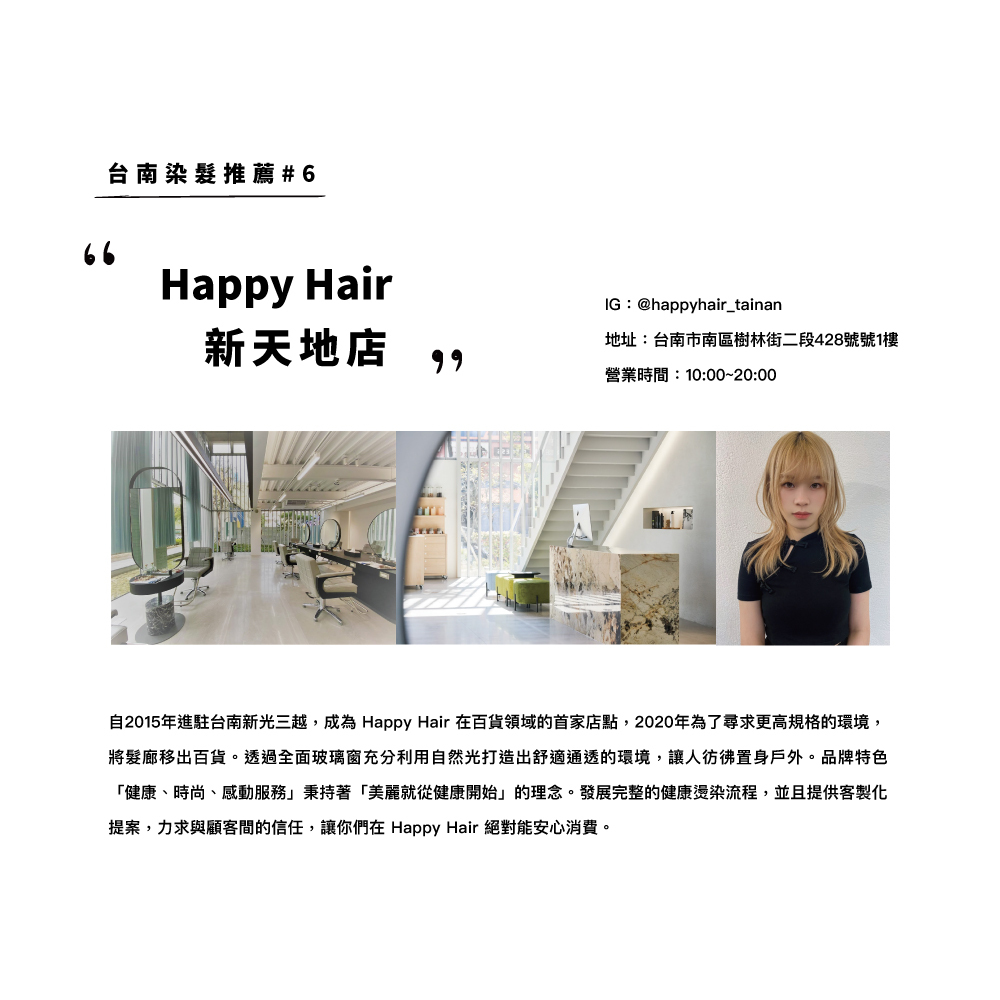 自2015年進駐台南新光三越,成為 Happy Hair 在百貨領域的首家店點,2020年為了尋求更高規格的環境,將髮廊移出百貨,全新打造近八十坪寬敞空間,採樓中樓挑高設計,氣氛跟環境與過去截然不同,透過全面玻璃窗充分利用自然光打造出舒適通透的環境,讓人彷彿置身戶外。品牌特色「健康、時尚、感動服務」,秉持著「美麗就從健康開始」的理念,發展完整的健康燙染流程,並且提供客製化提案,力求與顧客間的信任,讓你們在 Happy Hair 絕對能安心消費。