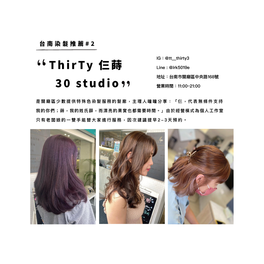 ThirTy 仨蒔30 studio 是關廟區少數提供特殊色染髮服務的髮廊,位於關廟知名麵包店深緣及水附近,主理人曈曈分享:「仨,代表無條件支持我的你們;蒔,我的姓氏薛,而漂亮的果實也都需要時間。」由於經營模式為個人工作室,只有老闆娘的一雙手能替大家進行服務,因次建議提早2-3天預約,但由於店內訊號較差容易漏掉電話預約,因此老闆娘建議大家加官方LINE進行預約。
