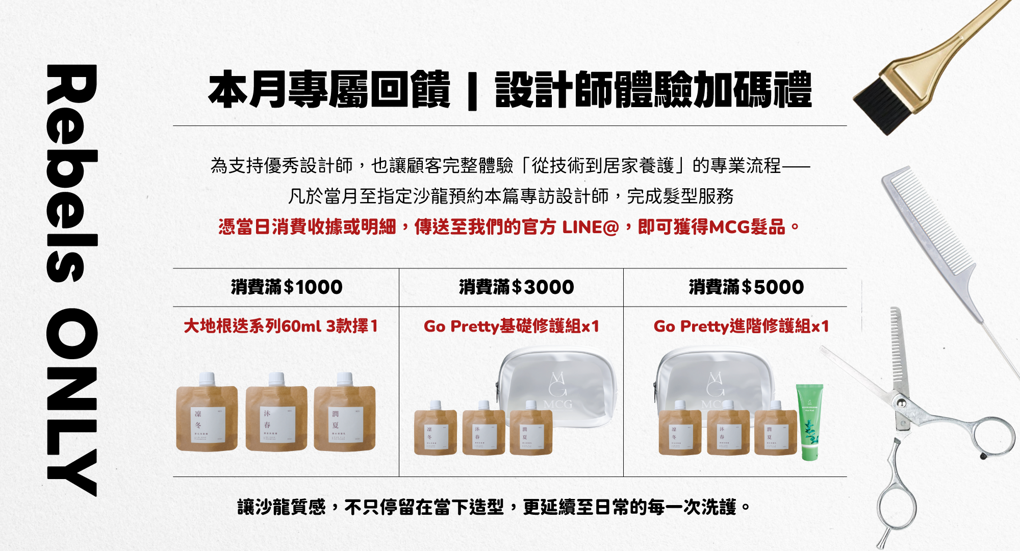 早期Rebels版面也是作品集,但慢下心來仔細思考後,認為自己顯然是為了想拍出好看的照片而創造作品,似乎迷失了客人到底會不會喜歡的初衷,所以才將眾多作品典藏。對他而言,只要與客人進行溝通後的結果,是客人最好整理最喜歡的模樣,那就是好的作品,因此他IG自介才會有一段話:「美變化無常,沒有代表作;你我之間的溝通,亦是代表作」。