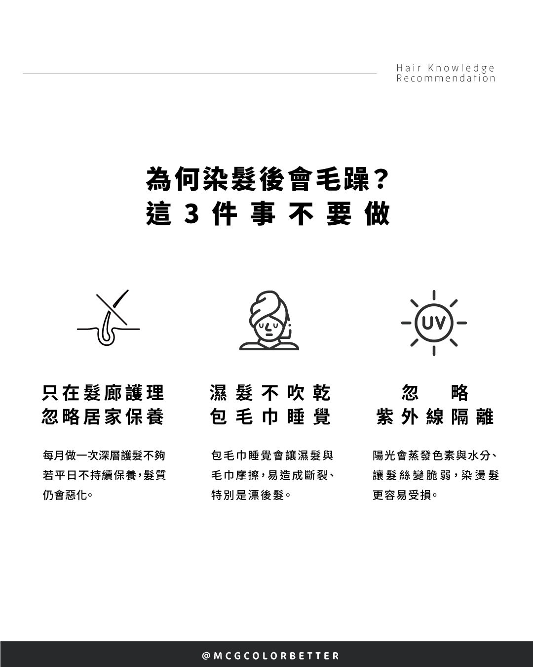 專業且有經驗的美髮設計師在幫客人進行染髮前,都有一套判斷風險的方式,這個步驟是為了避免在髮況不佳時染髮,不只沒染出理想髮色,還可能讓髮質雪上加霜。
