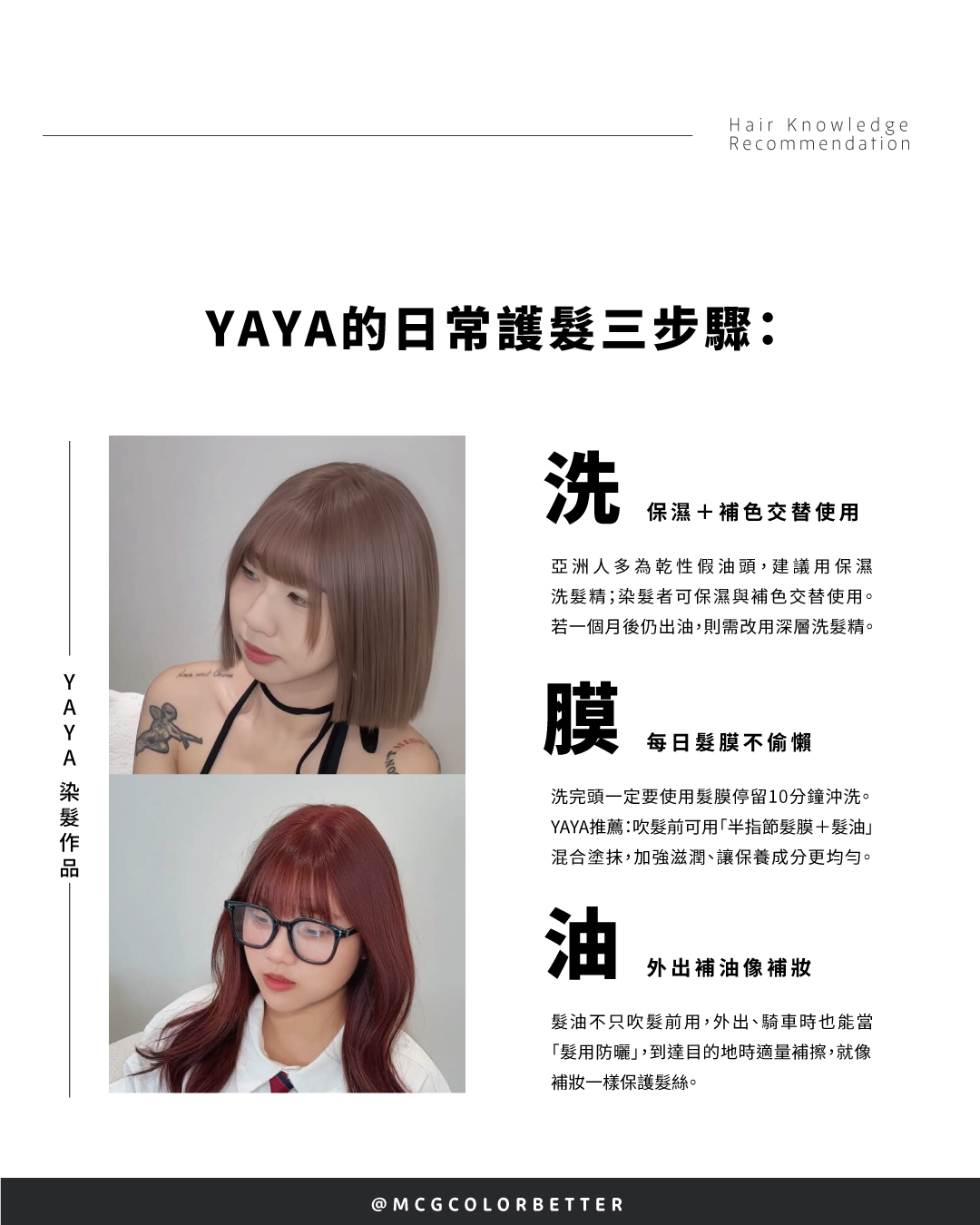 A:先用保濕洗髮精+髮膜養 2 週,把毛鱗片韌度墊高;染髮後依照 Yaya「天天三步驟」落實保養,就能毫無懸念享受並保養好新髮色。
