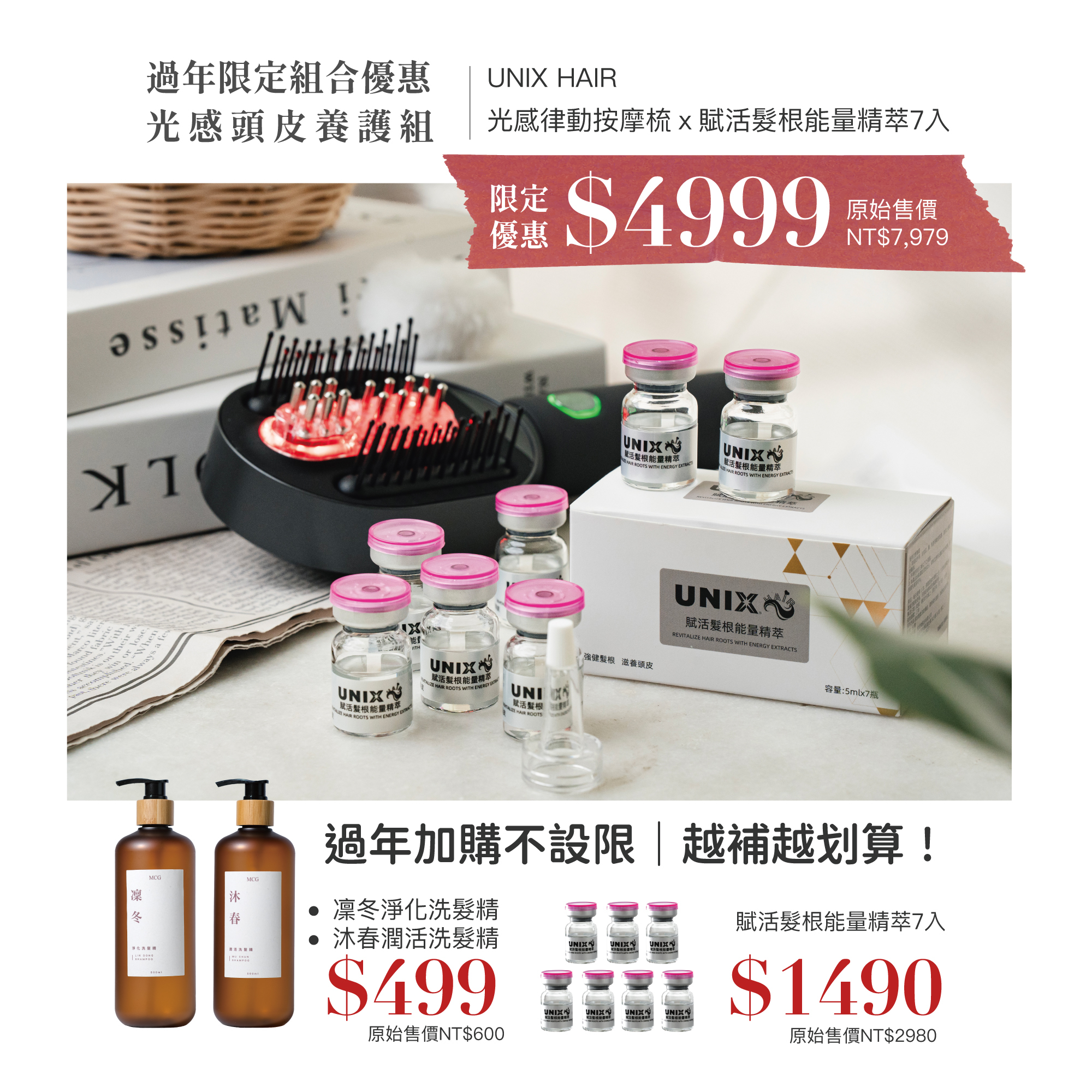 •UNIX HAIR 光感律動按摩梳 × UNIX HAIR 賦活髮根能量精萃 7 入,組合優惠價 $4,999