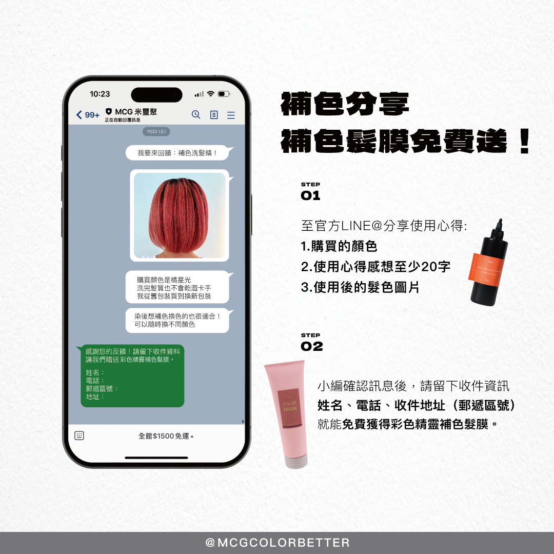 2. 投稿後,成功回饋即可獲贈補色髮膜290ml顏色任選(市價$1000)!