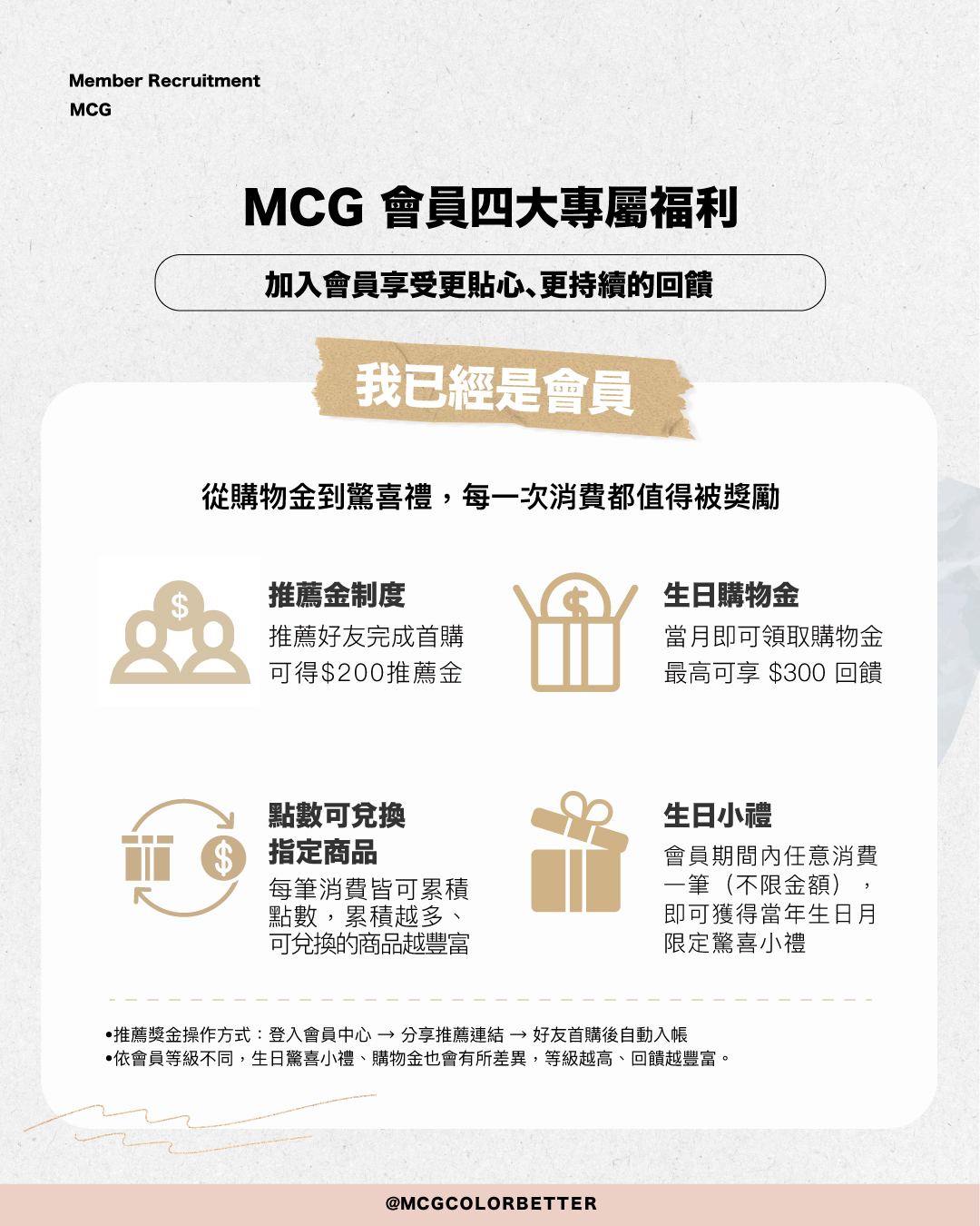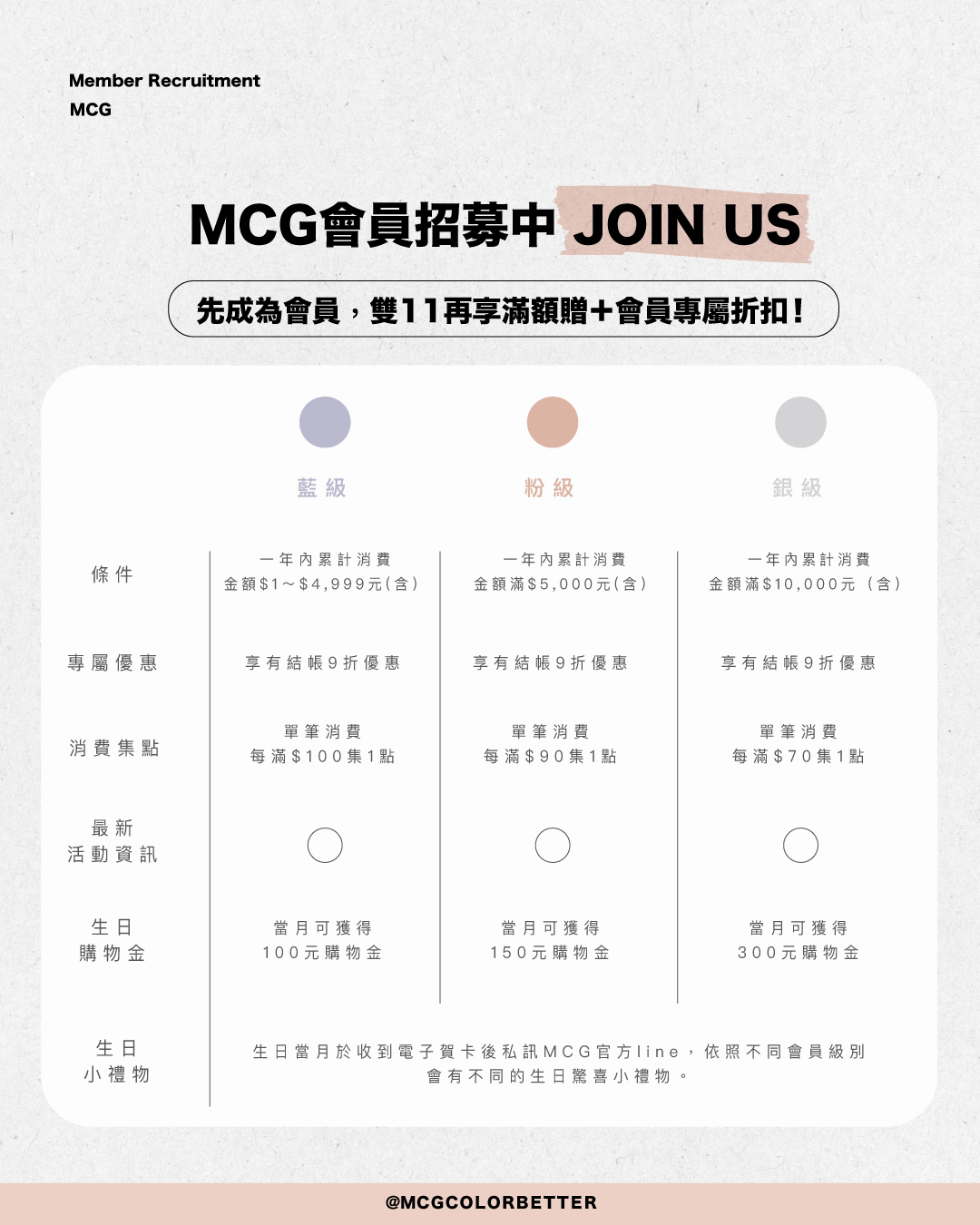 當月任意消費一筆(不限金額),即可獲得品牌限定生日小禮物【登入會員中心】→https://www.mcg.com.tw/users/sign_in