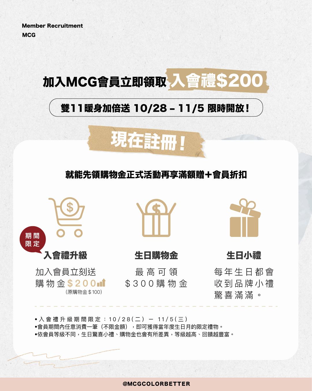 成功註冊 MCG 會員後,立即獲得購物金 $200