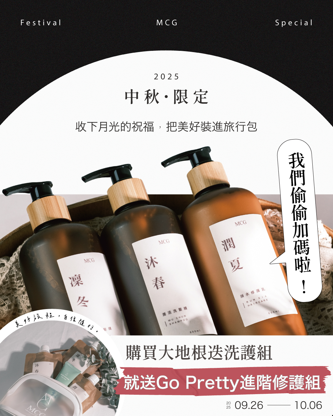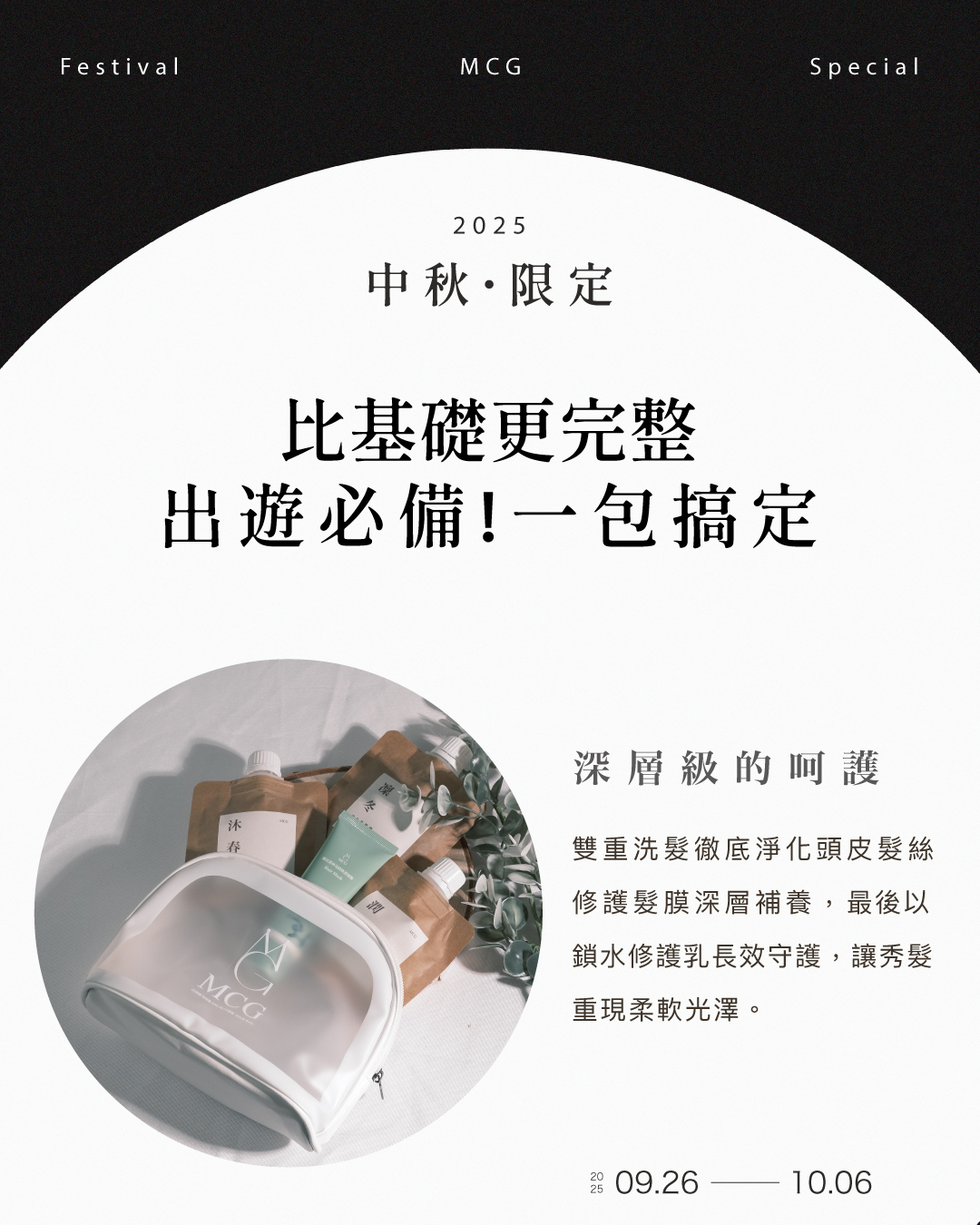 這個中秋,不只團圓,還要給秀髮最好的呵護。MCG 特別推出雙重優惠,無論居家或旅行,都能享受完整洗護體驗。