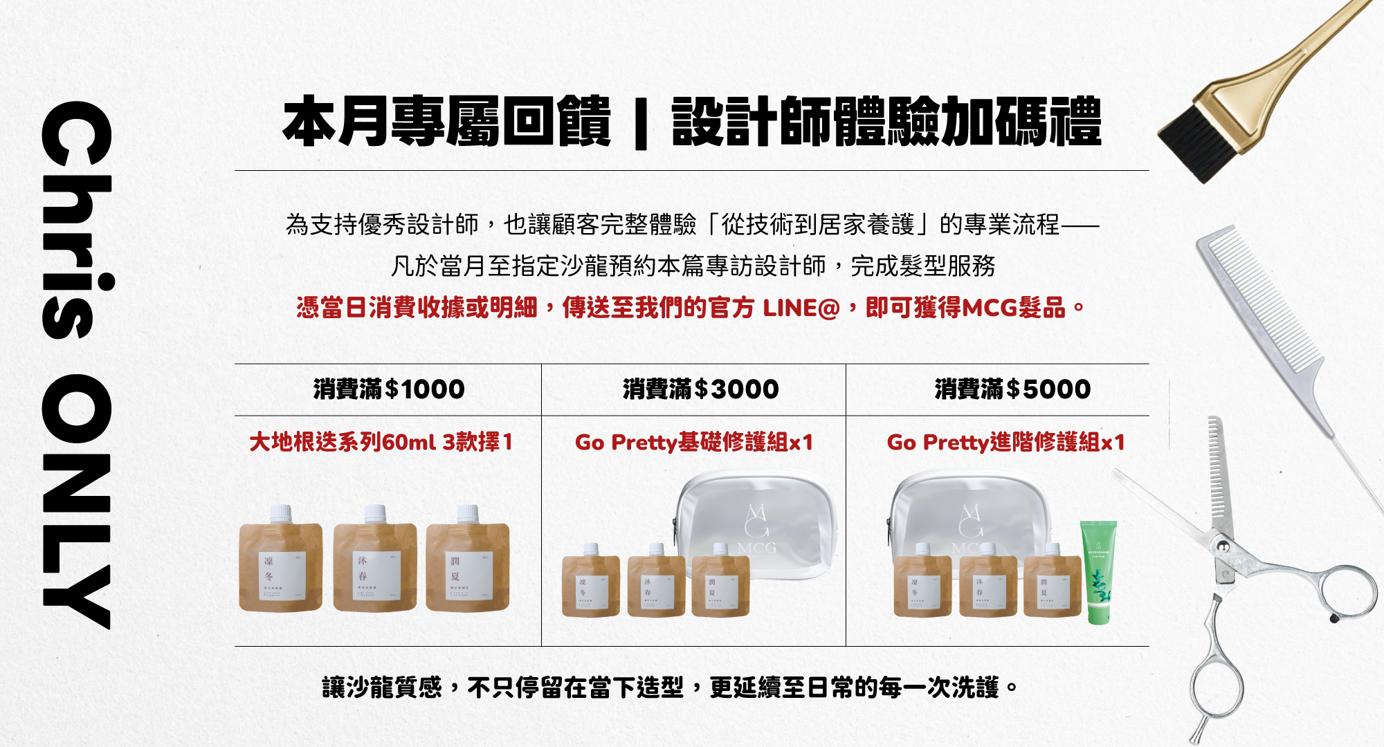 Chris, who has been in the hair industry for about ten years, has cared deeply about “looking good” ever since junior high school. Reflecting on those early days, he says, “When I was a kid, I used to see hairstylists always looking sharp and confident every day—that sense of pride really inspired me. That’s what made me choose to study hairdressing.”