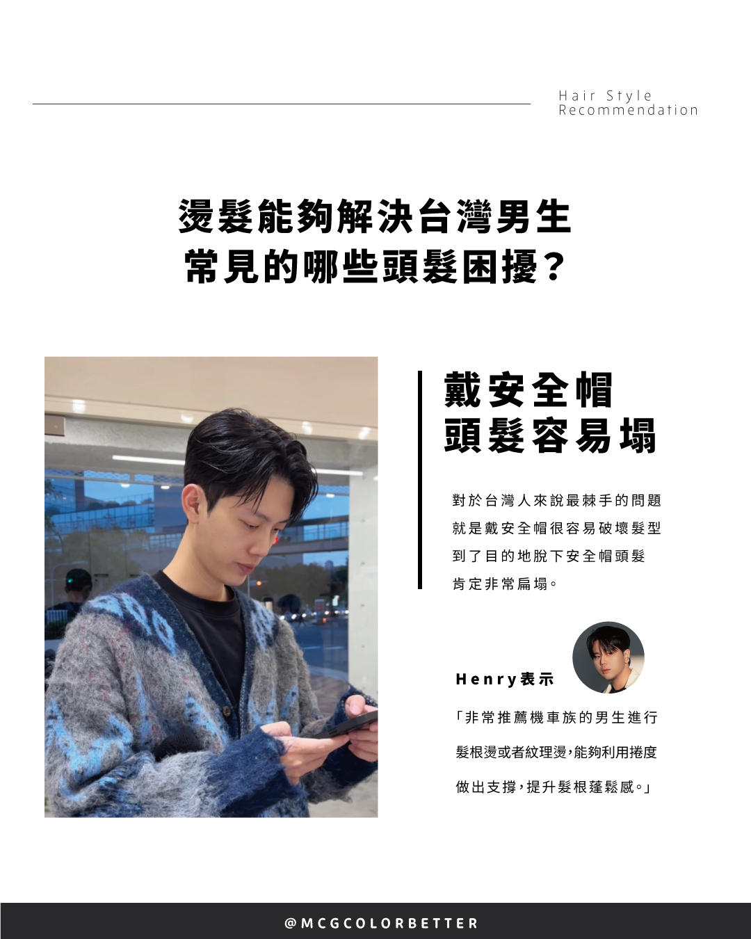 對於台灣人來說最棘手的問題就是戴安全帽很容易破壞髮型,到了目的地脫下安全帽頭髮肯定非常扁塌。Henry 非常推薦機車族的男生進行髮根燙或者紋理燙,能夠利用捲度做出支撐,提升髮根蓬鬆感。