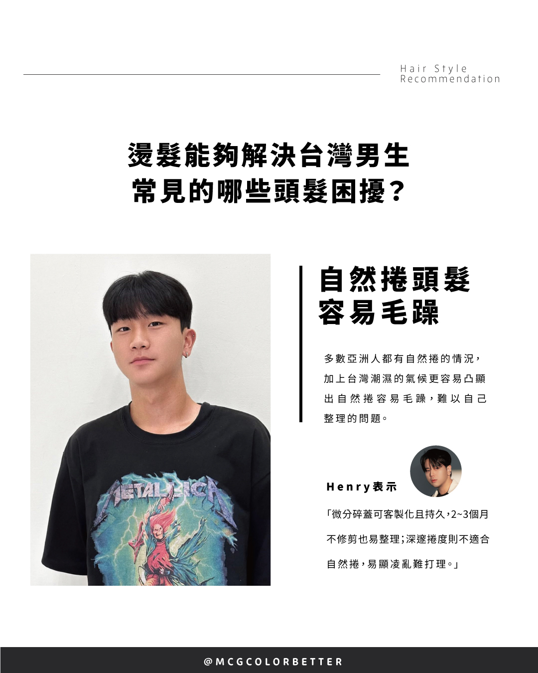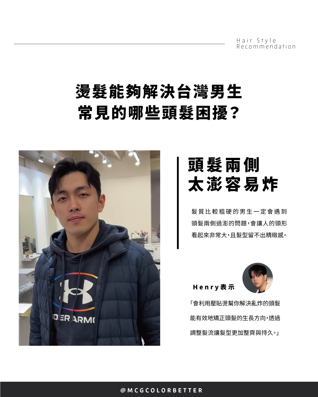 台灣男生在選擇髮型時,常常會遇到一些髮型困擾,例如頭髮塌、毛流不順、兩側過於澎鬆等。這些問題往往讓男生感到難以選擇適合的髮型,但透過一些燙髮造型就能夠解決掉許多問題,來看看 Henry 會運用哪些燙髮技術破解疑難雜症。