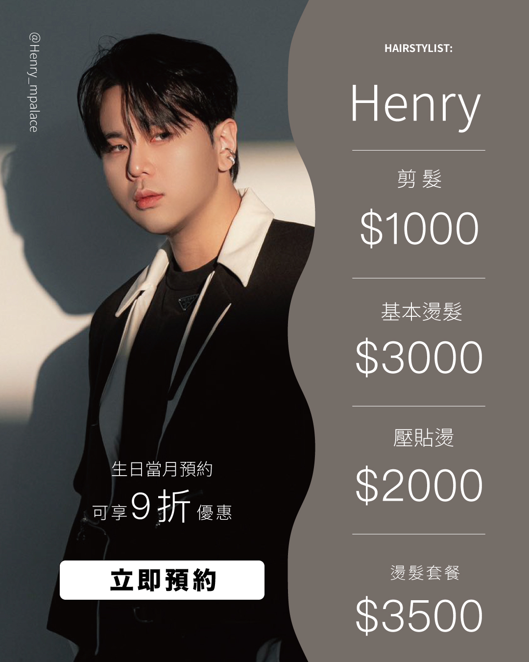 如果你同樣重視形象並希望呈現專業風格,不論想找出適合自己的風格,或者單純希望解決日常髮型困擾,立即預約 Henry 打造最符合你需求的髮型,Henry 的基本剪髮價格為$1,000,基本燙髮(含洗剪)$3,000,壓貼燙(含洗剪)$2,000,燙髮套餐(燙髮+壓貼)$3,500,生日當月預約可享9折優惠!