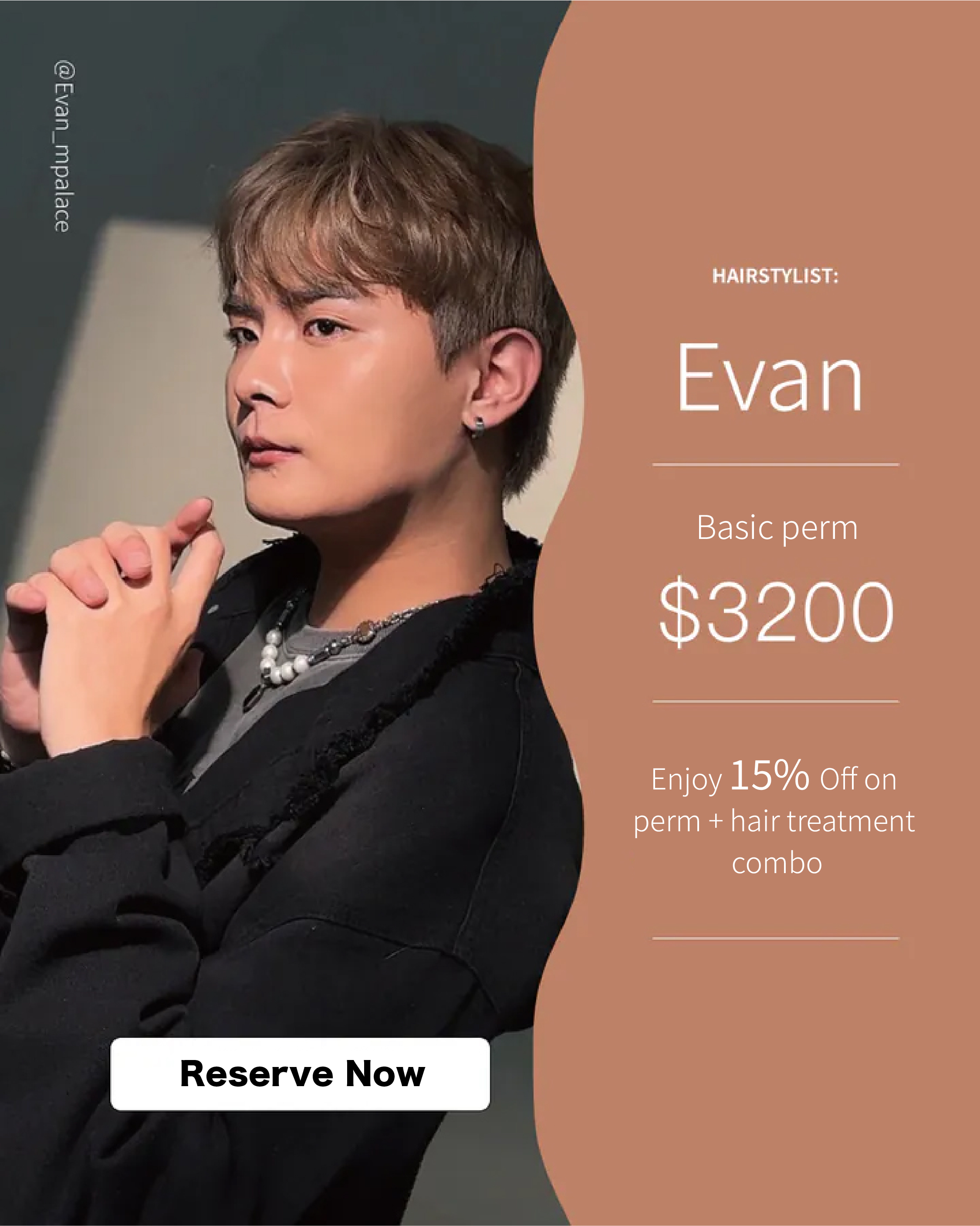If you want a makeover but aren’t sure which men’s hairstyle suits you, Evan offers basic perms starting at $3,200. Enjoy a 15% discount when you get a perm combined with hair treatment. Click the hairstylist info below to consult with Evan and start your transformation—become the heartthrob who turns heads everywhere you go!