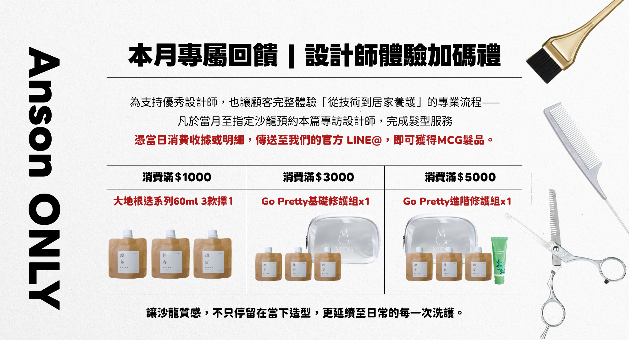 最後Anson強調,需要定期回髮廊護理及補色,「很多人染髮之後會發現髮質變差,其實會建議回來做深層護理。尤其是漂髮,更需要做定期護理。這樣頭髮才不會變得毛躁,看起來更有光澤。」透明感髮色需要時常維護,因為淺色容易褪色,若是對於髮色品質有高度需求的人,建議每隔一段時間回髮廊進行補色和護理。