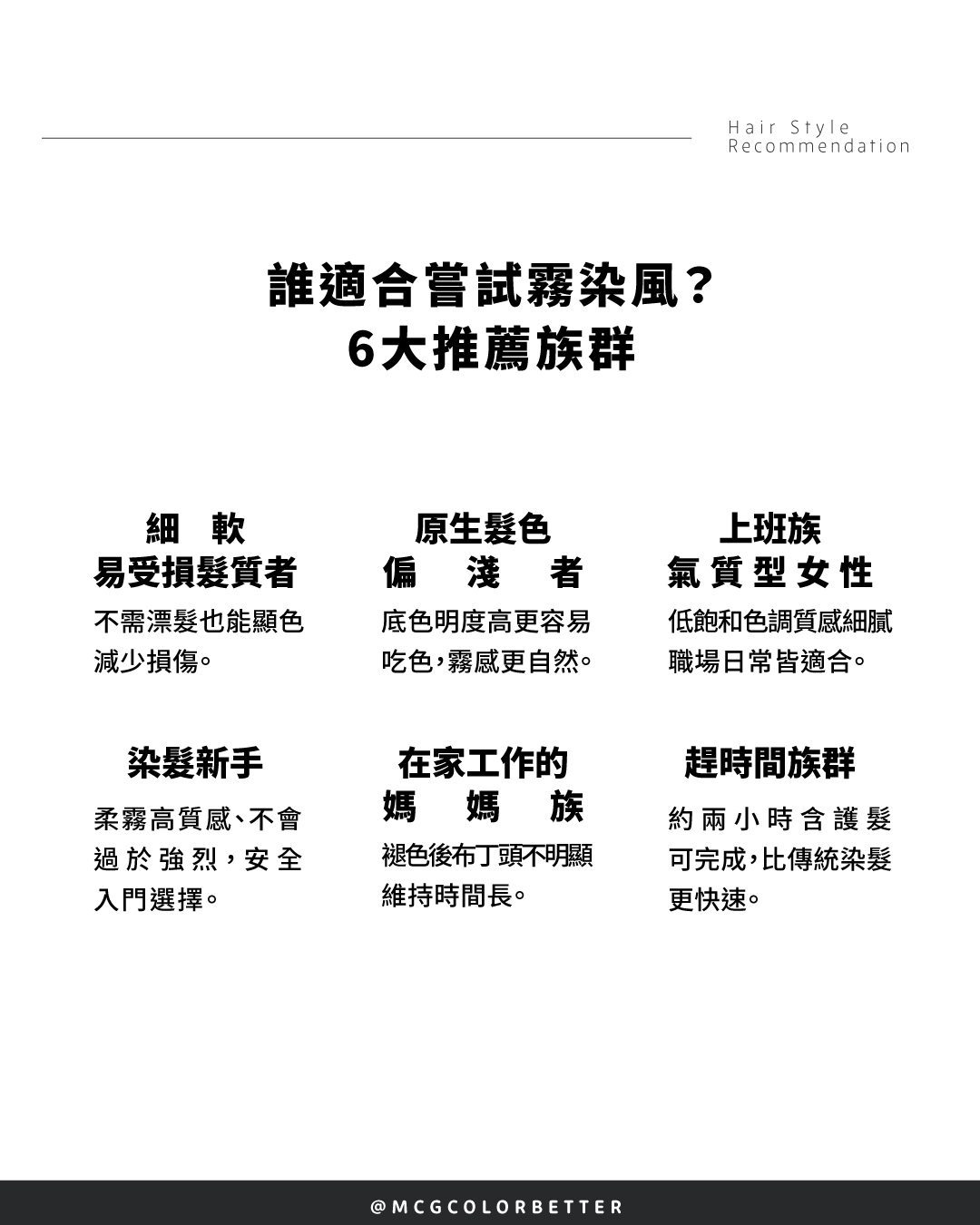 適合染髮後想看出變化又不想過於冒險的人,不會太強烈的霧染風就非常適合你,注重柔霧與高質感,是初次染髮的安心選擇。
