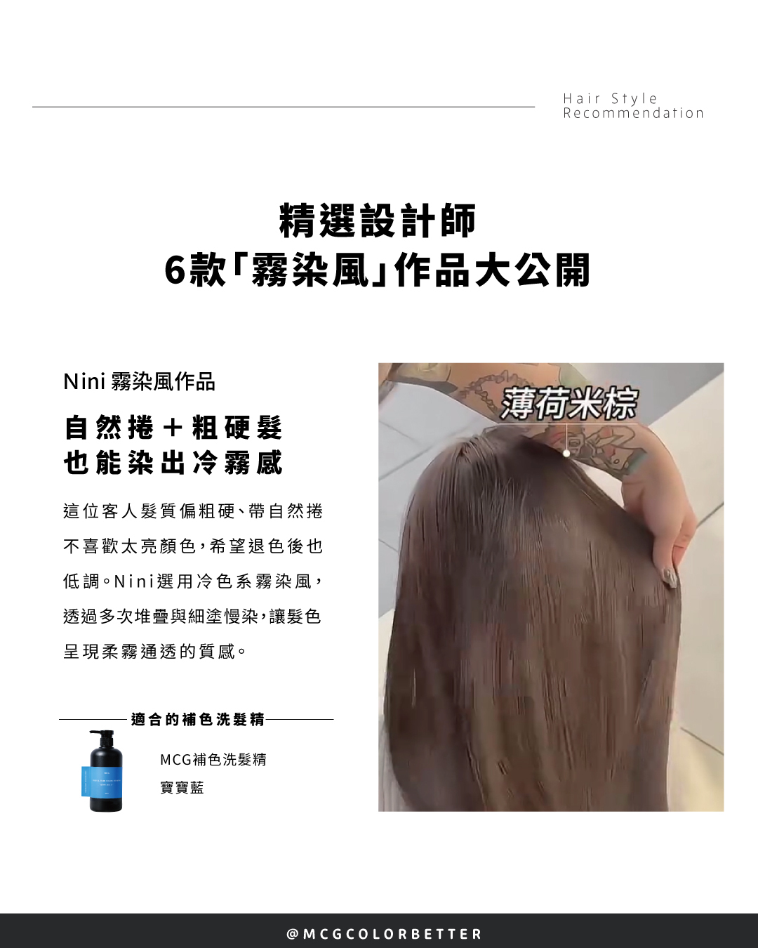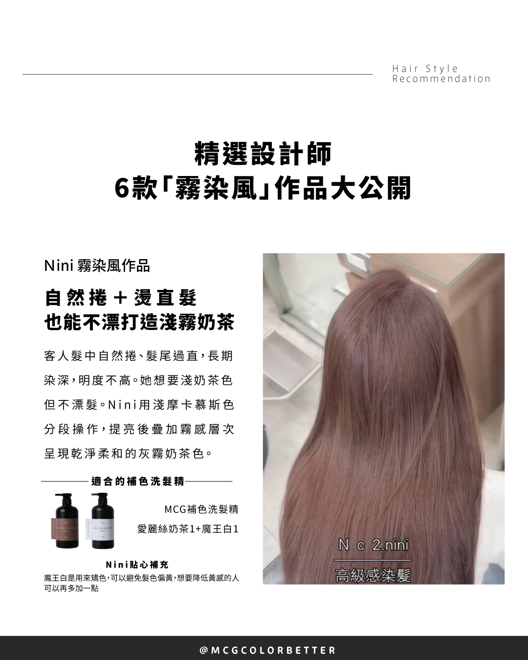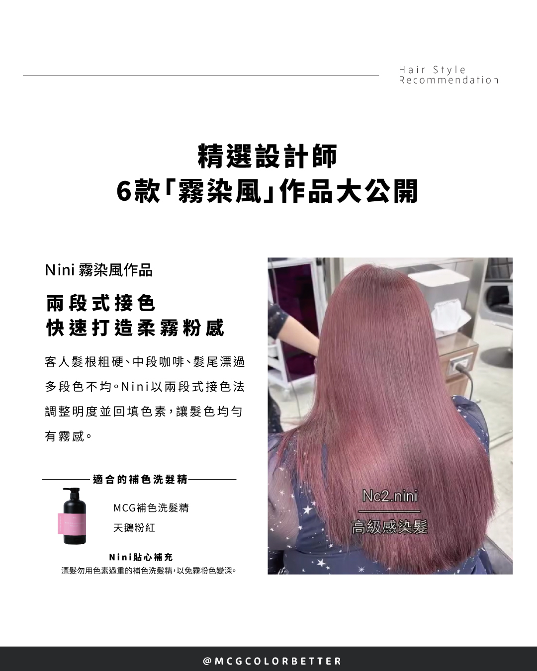 Nini 貼心補充:漂過的頭髮不可以使用色素太重的補色洗髮精,否則柔霧粉感的顏色就會變太深。
