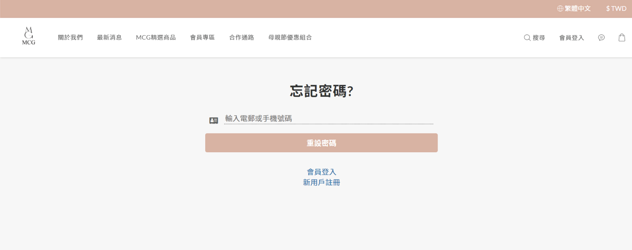 謝謝您一直以來對MCG米璽聚的支持。我們很開心通知您MCG米璽聚官網已於近日完成改版升級,我們期待新網站能提供給您更好的購物體驗。我們已將您在MCG米璽聚官方網站的原有會員帳號移轉,為保障您的個資安全,需要您至新官網重設密碼。(請使用當初辦理會員的Email帳號進行登入)