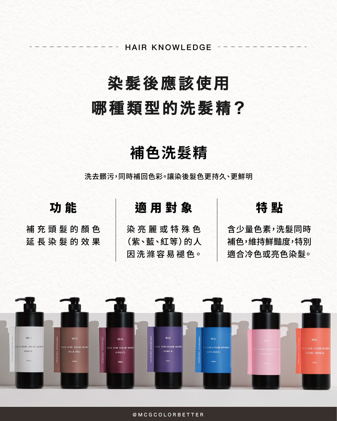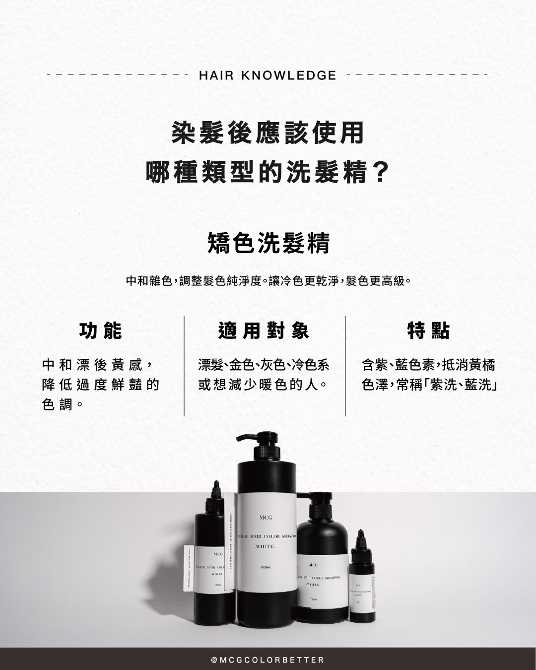 想讓染髮後的髮色持久亮麗,就要挑選適合的洗髮精!推薦你試試 MCG彩色精靈護色靚露,不僅能延長髮色壽命,還有獨特的矯色功能,讓你的髮色更純淨。且購買前還可以私訊客服,讓專業諮詢為您挑選適合你的護色精靈!