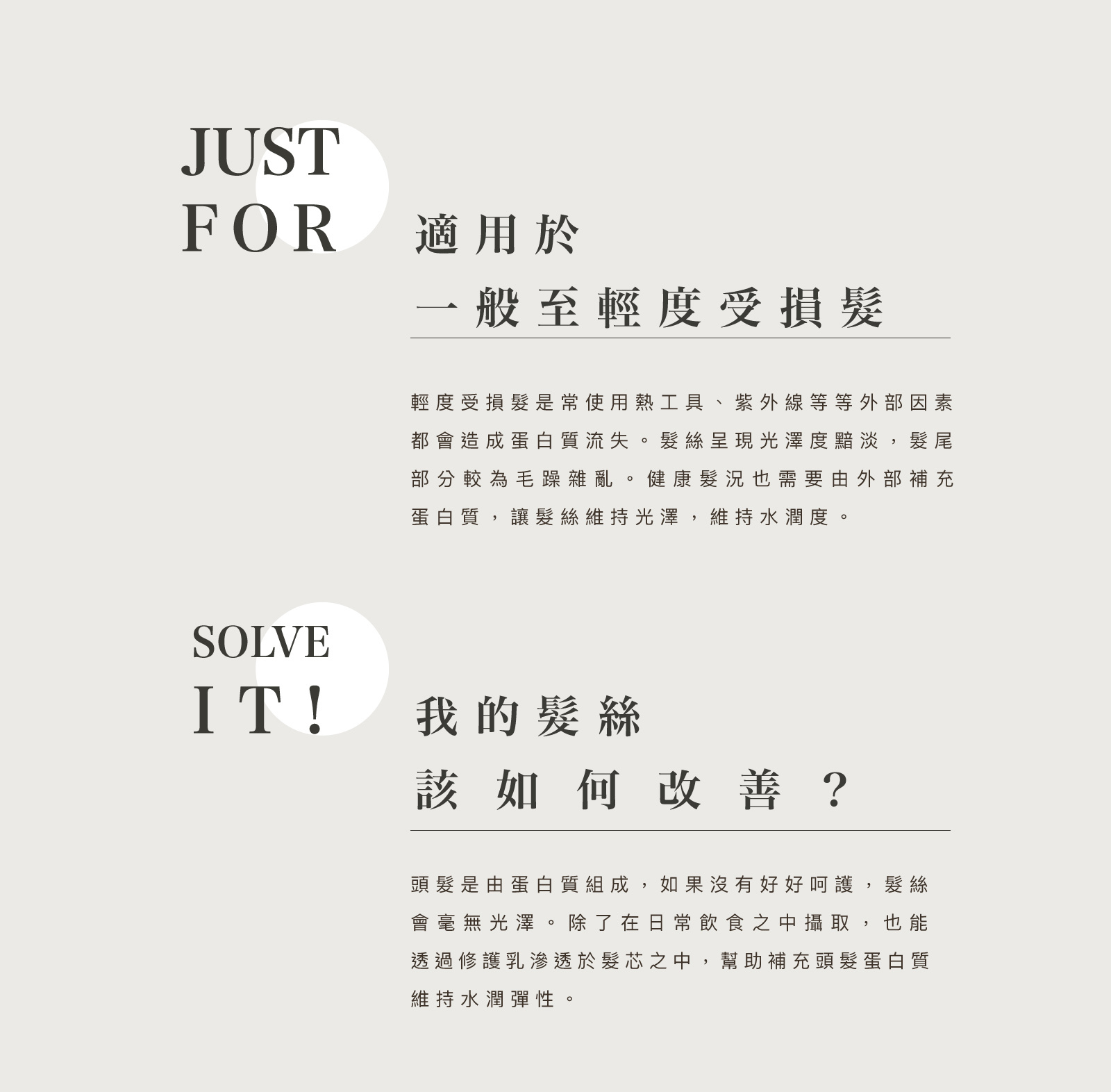 針對受損髮絲給予極致深層修護,使秀髮重回閃耀光澤。時時刻刻幫你細心照顧,現在開始,帶上它,髮質的呵護並不困難。