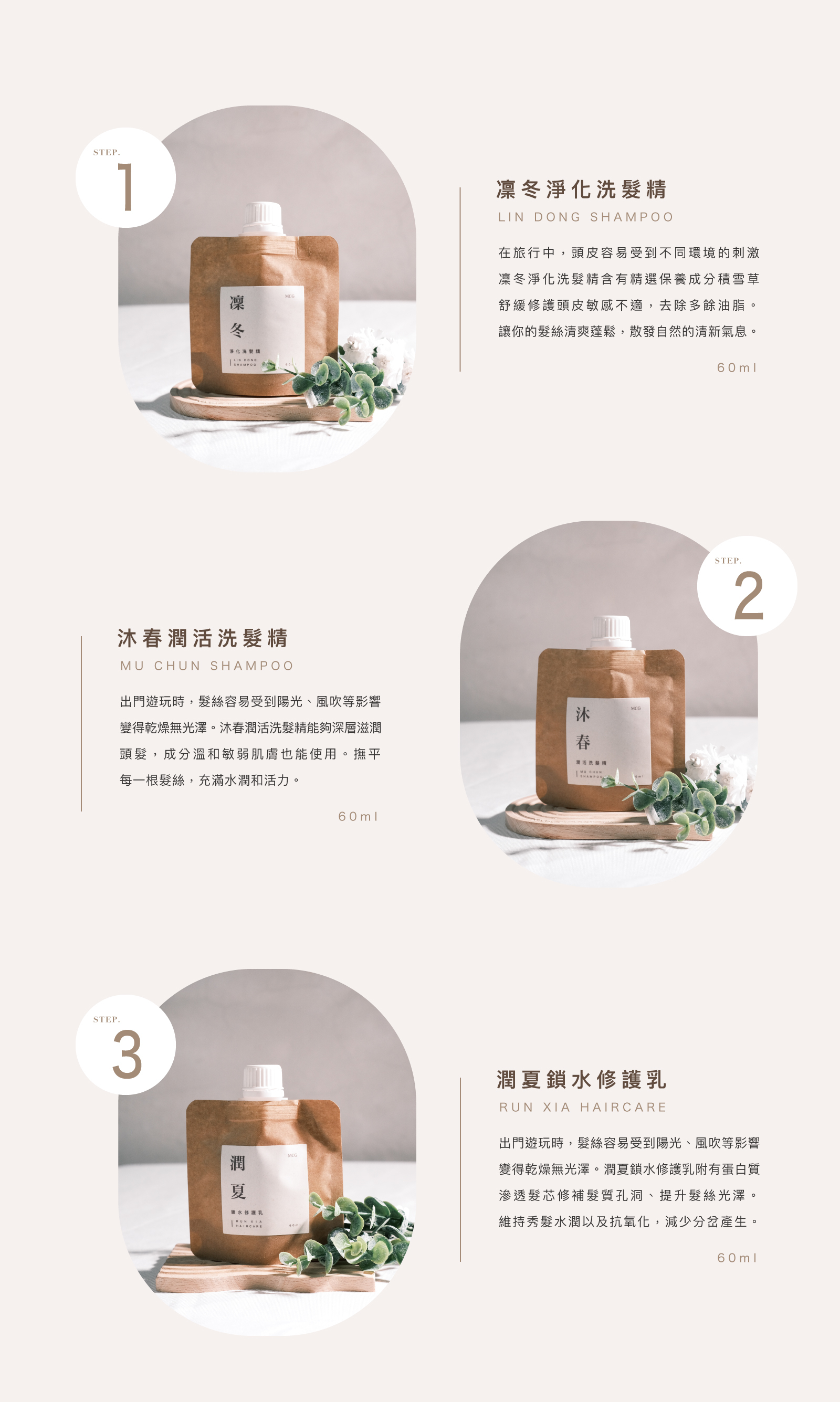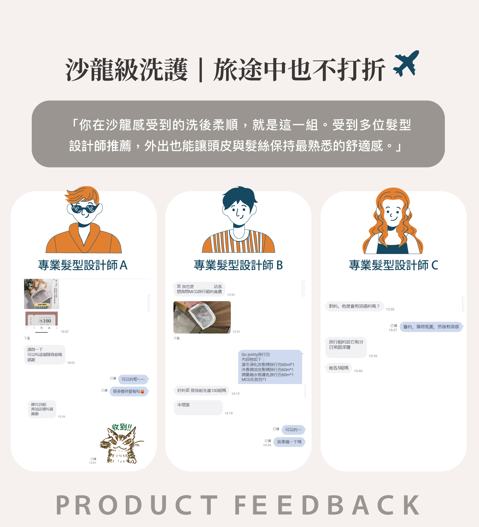 解決出遠門攜帶瓶瓶罐罐髮品困擾,旅行包內有洗髮精、髮膜,從洗頭到修護髮絲都幫你準備好。