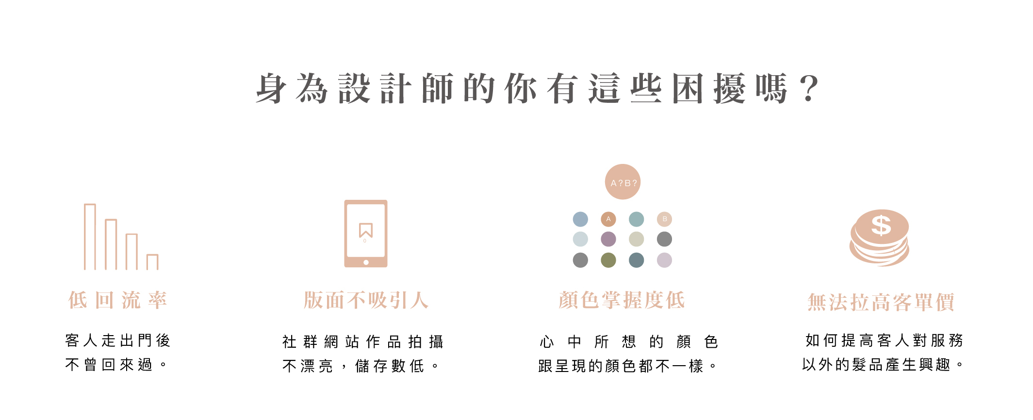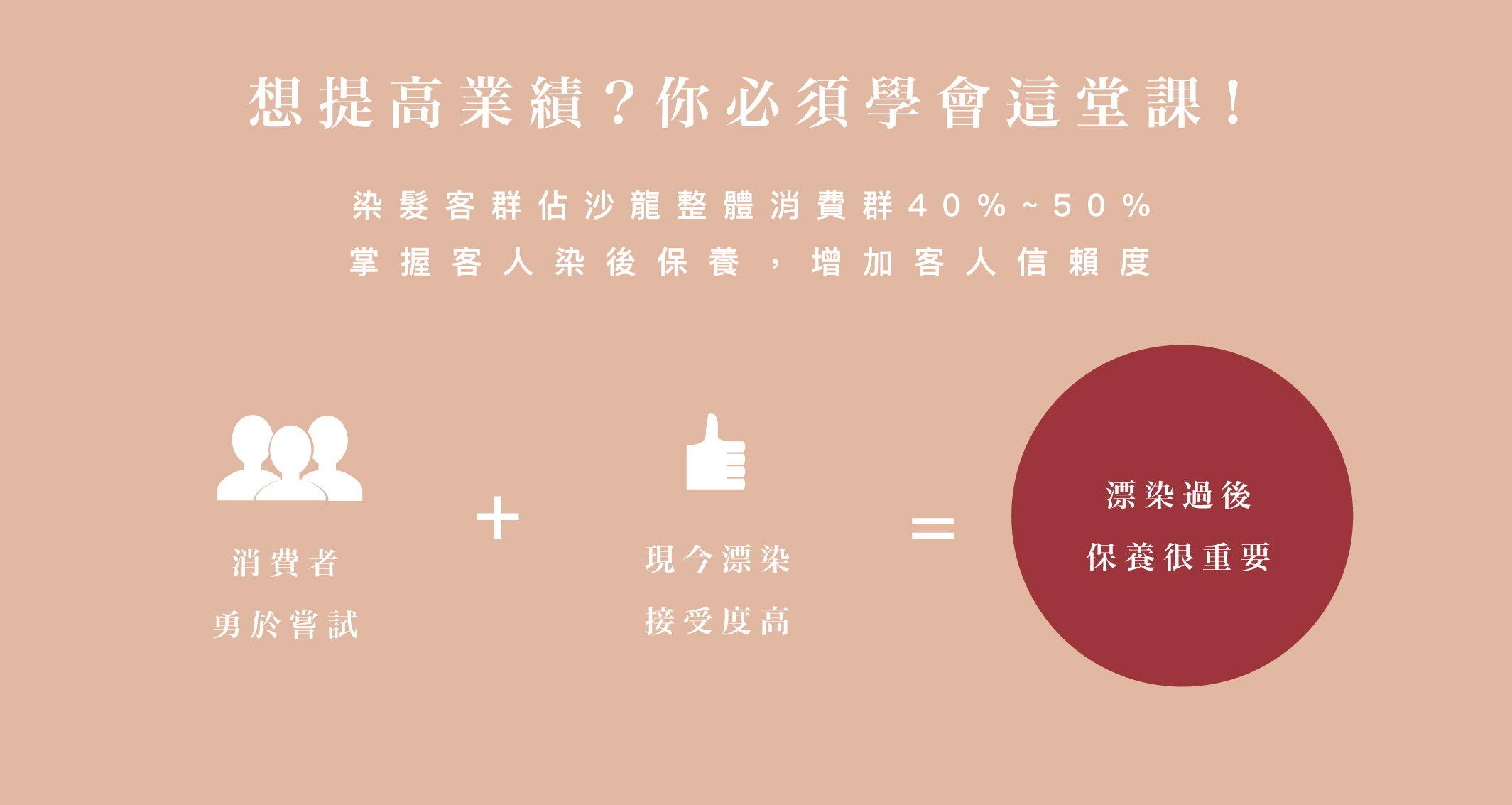 沙龍整體消費群光是染髮客群就佔了一半的比例,染髮客約三個月週期回髮廊整理一次頭髮,增加染髮客群的信賴度絕對是提升客人回流率的絕佳辦法。