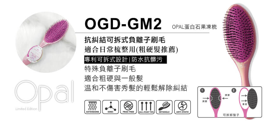 【Olivia Garden】Opal 果凍梳 是專為時尚愛好者設計的限量款造型工具,採用可拆式設計,輕巧且方便清潔。該系列結合了三款針對不同髮質的特殊刷毛設計,滿足從粗硬髮到細軟髮的需求。其獨特的防靜電負離子技術,能有效減少毛躁、增添光澤。無論是粗硬髮、細軟髮或是混合髮質,Opal 果凍梳都能輕鬆撫平毛鱗片,讓髮絲持續順滑亮澤。