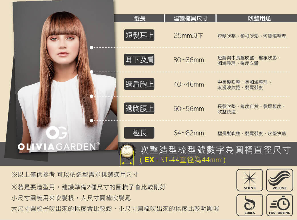 適用於日常造型,如髮根蓬鬆、瀏海整理、直髮與捲髮造型。搭配吹風機使用,根據造型需求調整梳子角度和使用時間。